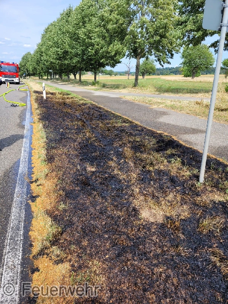 Wir wurden zu einem Flächenbrand auf der Strecke zwischen Ortseingang und Autobahnauffahrt alarmiert. Dort brannte die Böschung auf einer Länge von etwa 20 Metern. Der Brand wurde mit den 2000 Litern mitgeführtem Wasser des LFs und zwei C-Strahlrohren abgelöscht und die Einsatzstelle parallel gegen den fließenden Verkehr abgesichert.